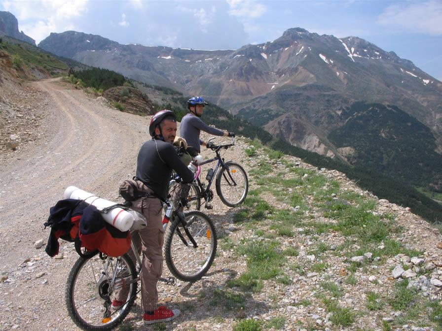 Acele etmeden bisikletlerimizi topladık, ayarlarını yaptık, çantaları yerleştirdik. Bu arada sabah erken kalkmış birkaç vatandaşla da sohbet ediyorduk. Yol hakkında sorular sorduğumuzda herkes yolu az çok biliyordu ama çok dik olduğunu söylüyorlardı. Hepsi ağız birliği etmiş gibi çok uzaklarda görünen dağı işaret edip, zirveye çıkacaksınız diyordu. Fotoğraf 303Hpim8980._400.jpg